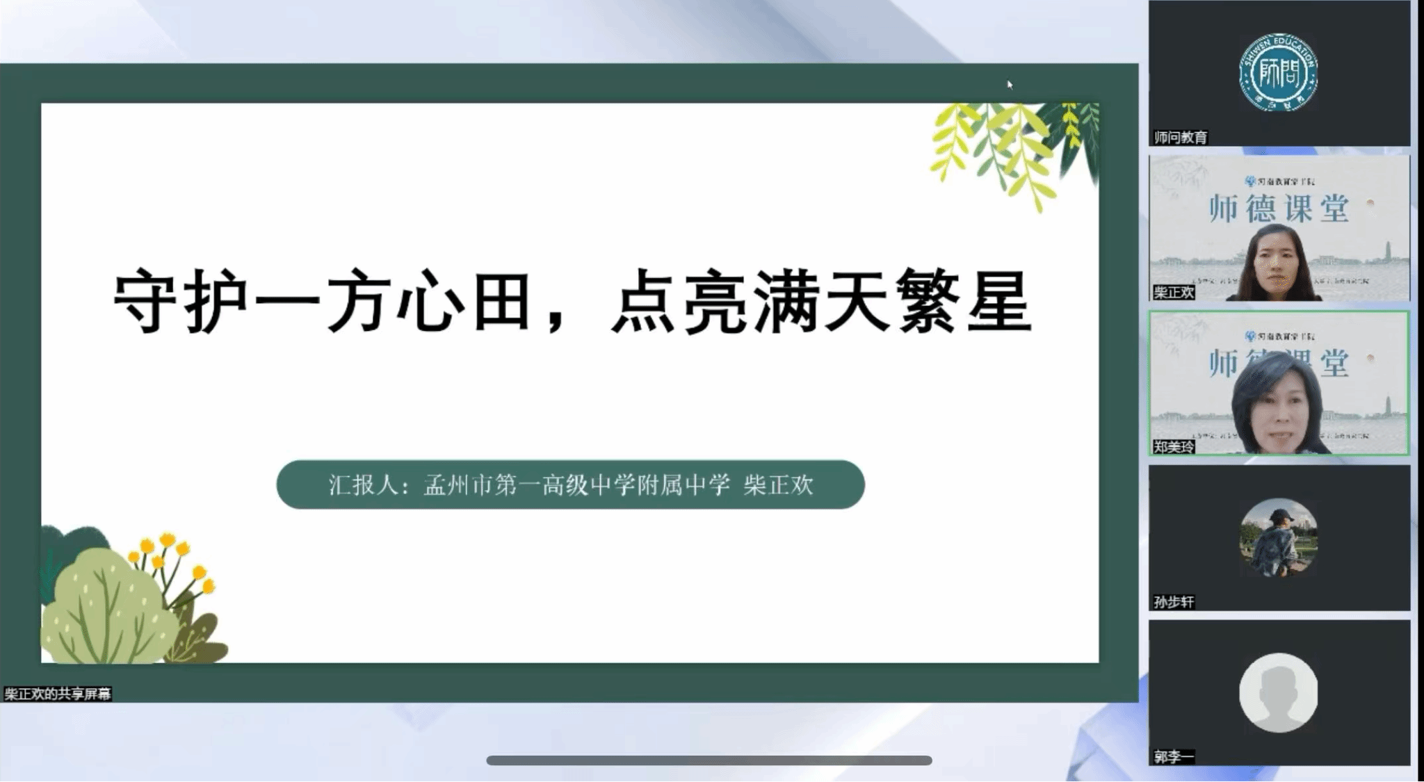 10月9日15:00,河南教育家书院师德课堂第十季第一讲顺利开讲。本次讲座邀请到孟州市第一高级中学附属中学教师,河南省师德先进个人,河南省优秀乡村青年教师,河南省骨干教师,焦作市最美教师,河南省优质课一等奖获奖者柴正欢老师,作题为“守护一方心田,点亮满天繁星”的讲座。本次讲座依托河南教育家云书院举行,由河南大学教育学部郑美玲教授主持。
