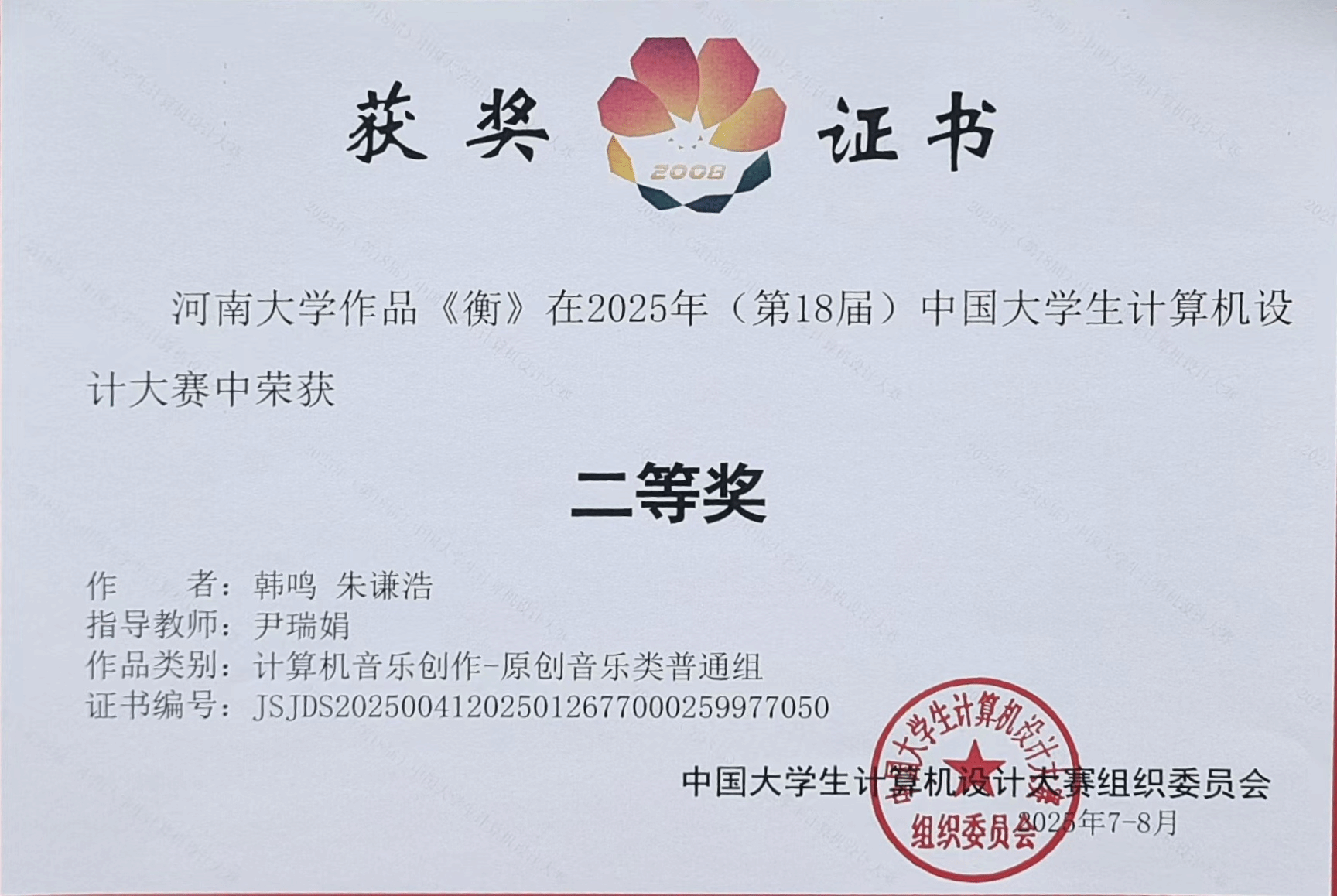 8月至9月间,我部多件作品晋级2025年(第18届)中国大学生计算机设计大赛全国总决赛。经过激烈的角逐,取得国家级二等奖1项、国家级三等奖若干的优异成绩,再创新高。其中,在我院老师尹瑞娟指导下,由2024级学生韩鸣、朱谦浩组成的参赛队伍携作品《衡》在荣获河南省特等奖后晋级国赛,顺利斩获全国二等奖,展现出我院学子积极拓宽视野、勤于上进的良好精神风貌。