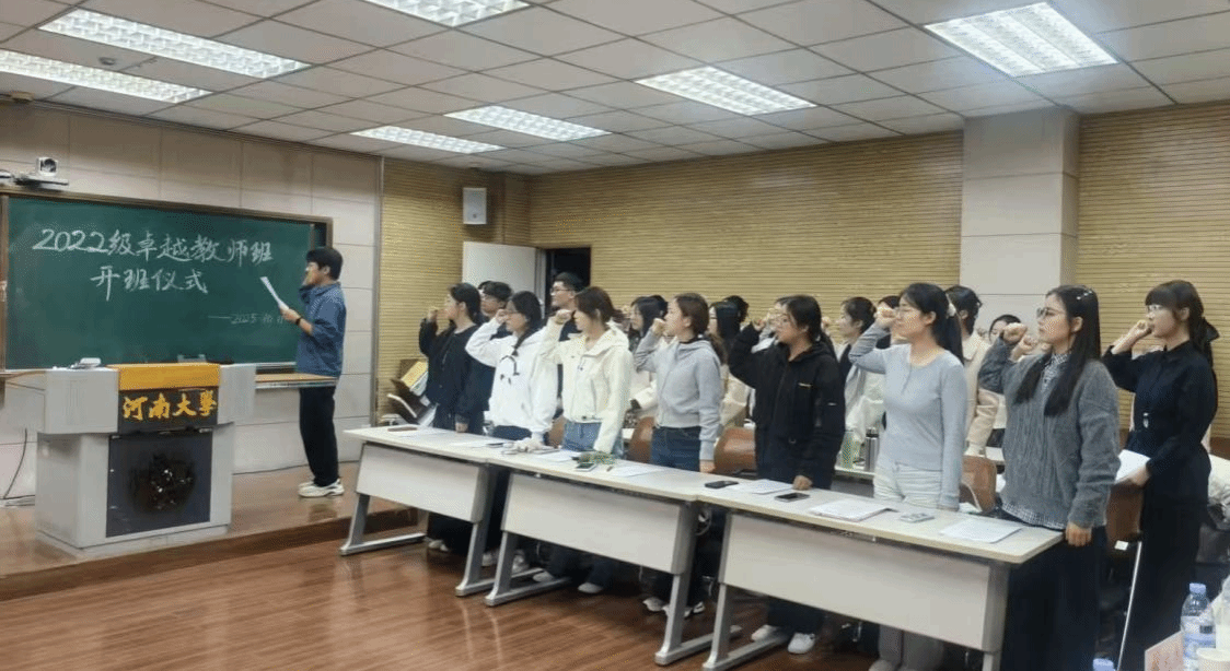 2025年10月11日下午,河南大学2022级“本硕一体化卓越中学教师计划”项目班开班仪式在7号教学楼7504教室举行。河南大学教育学部副部长、教师教育学院院长郝兆杰,教育学部教师教育学院副院长王晋,教务处副处长张琨,研究生院副院长李志芳,卓越教师班牵头导师、河南省特聘教授李桂荣,卓越教师班牵头导师、河南大学长聘教授郑美玲,卓越教师班班主任权培培以及2021级、2022级卓越教师班全体学生出席本次仪式,仪式由王晋主持。