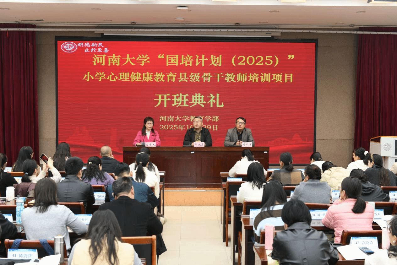 10月29日上午,河南大学“国培计划(2025)”小学心理健康教育县级骨干教师培育项目开班典礼在教育学部一楼报告厅举行。河南大学教育学部常务副部长、心理学院院长李永鑫、河南大学教育学部基础教育研究院副院长刘学军出席开班典礼,来自省内的50名学员参加此次开班典礼,典礼由刘学军主持。