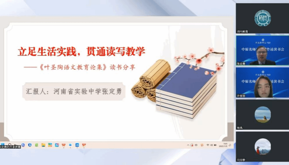 2025年11月11日,河南大学中原名师流动工作站围绕《叶圣陶语文教育论集》一书开展第十九期读书会。本次读书会由河南大学教育学部副教授许丽丽主持,中原名师及其工作室成员、河南教育家书院研究员以及学部部分师生在线参与。