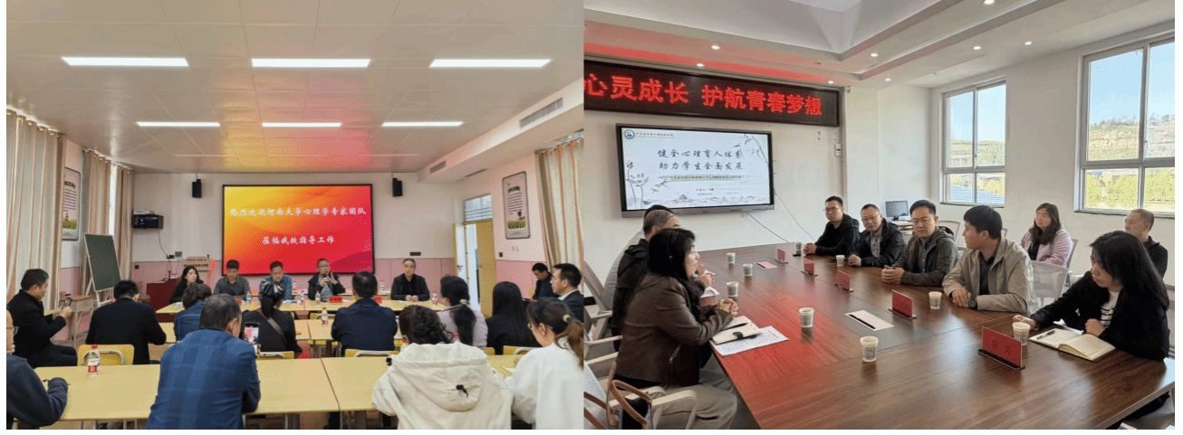 调研过程中,专家团队通过实地察看、座谈交流、查阅资料等多种形式,全面了解各学校心理健康教育工作的实施细节。在官道口镇中学,专家团队参与了主题为“健全心理育人体系 助力学生全面发展”的座谈,听取学校心理健康教育工作汇报,围绕课程设置、危机干预机制、教师队伍建设等问题展开深入交流;在育才中学,团队现场查看了心理健康教育工作成果展板,直观了解学校心理健康活动开展情况;在实验中学,专家们认真翻阅心理健康教育档案资料,与学校负责人探讨心理健康教育从“零”到“优”的建设路径;在实验高中和卢氏县一高,团队实地走访心理辅导室,查看功能室建设与使用情况,对心理课程开设、团体辅导活动、学生心理档案管理等工作进行细致指导。