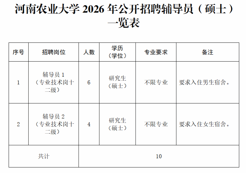 详见附件《河南农业大学2026年公开招聘辅导员(硕士)一览表》。
