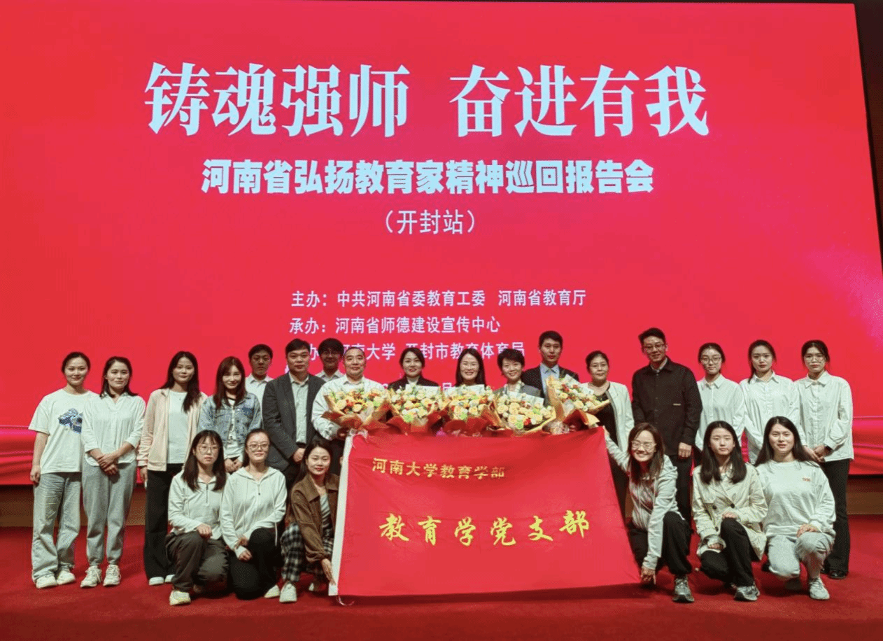 9月19日上午,由河南省教育厅主办的“铸魂强师,奋进有我”师德巡回报告会(开封站)在河南大学金明校区图书馆一楼报告厅成功举办。教育学部师范生代表在教育学党支部书记王星霞和支部党员教师许丽丽、杨艺伟、教师代表王海凤的带领下,共同观听河南省教育家精神巡回报告会,深入学习新时代教育家精神。