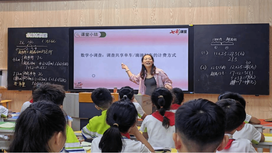 其次,五年级兰蓓老师在“小数乘法——分段计费问题”教学中,从学生熟悉的出租车计费切入,通过动态路线展示,引导学生理解起步价和分段计费规则。进而,启发学生联系水电费、共享单车等生活中丰富的分段计费实例,帮助学生体会数学的现实意义。并以计算水费的真实问题和课后开展计费方式调查等方式,强化学生的数学应用意识与问题解决能力。