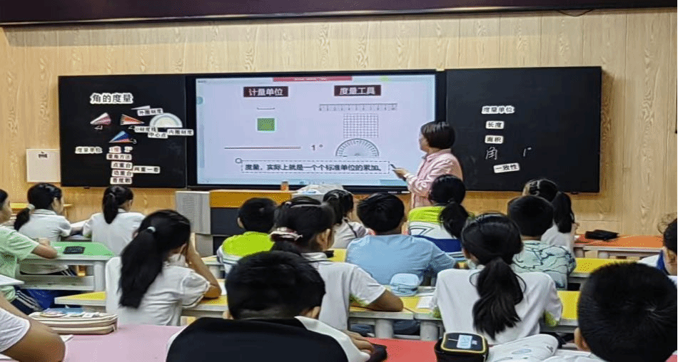 首先,四年级张永灵老师在“角的度量”一课中,以“山路抉择”情境导入,引导学生通过知识类比,理解角的度量原理。通过教具演示和关键提问,自然引出“1度角”这一计量单位,并借助对量角器构造的探讨,帮助学生深入理解“角的大小与边长无关”的本质概念。课堂以“设计量角器”的创意作业结尾,有效提升学生的创新与实践能力。