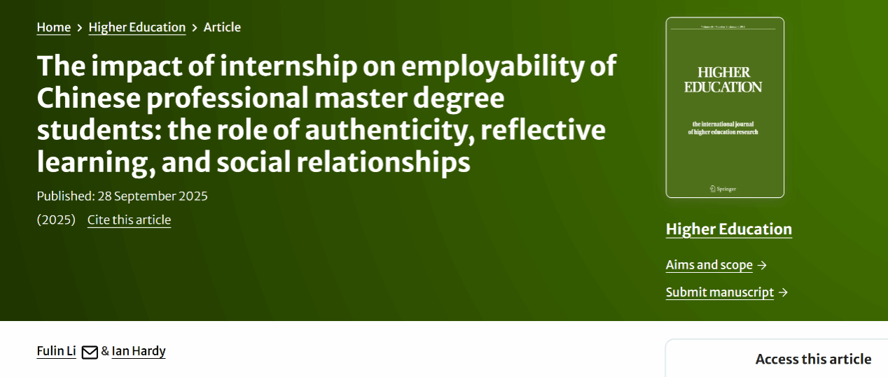 近日,教育学部教育学系青年教师李福林在国际顶级期刊《Higher Education》上发表论文“The impact of internship on employability of Chinese professional master degree students: the role of authenticity, reflective learning, and social relationships”。该研究在我国推进就业优先战略、实施学术学位与专业学位研究生分类发展的背景下,将学界对以实习为代表的分类培养环节的关注,从是否实习拓展至实习的任务性质与学习机制。研究基于全国性的调查数据,构建了兼顾主观与客观的就业能力测量框架,将就业能力拆分为求职能力与持续就业能力,既关注短期求职效果,也强调职业延展性,为后续研究提供了更为精细的概念工具。研究不仅分析了实习参与及时长,更将“实习真实性”细分为认知真实性与环境真实性,并引入反思性学习和社会关系发展两条中介路径,系统揭示实习对就业能力的多维作用机制,展示文化传统对就业能力形成的复合影响,同时通过多元统计方法验证了结果稳健性。