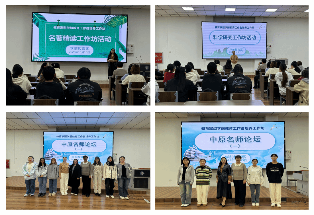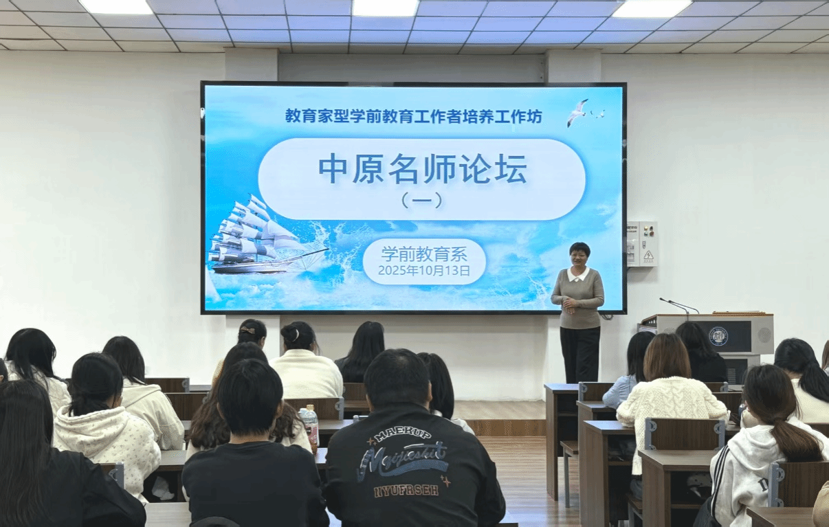 2025年10月13日,河南大学教育学部学前教育专业第一期中原名师论坛在教育学部2楼报告厅举办,同时开展了“教育家型学前教育工作者培养工作坊”的活动及2024级学前教育专业本科生与实践导师见面会。本次活动由学前教育系主任张亚杰、李锦老师主持,特邀中原名师吴慧玲、邓萍开展专题分享,学前教育专业本科生到场聆听学习。