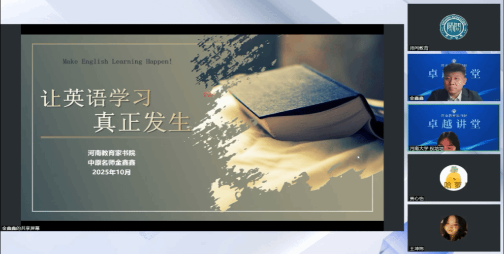 10月17日晚19:00整,河南教育家书院卓越讲堂第四季第九讲顺利开讲。本次讲座邀请到郑州金水区外国语学校副校长,河南省教育家书院第四批合作研究员,中原名师,河南省教师教育专家,河南省教育厅学术技术带头人,金水领航教育名家金鑫鑫作题为“让英语学习真正发生”的讲座。本次讲座依托河南教育家云书院举行,由河南大学教育学部卓越班班主任权培培主持。