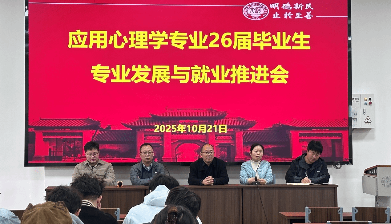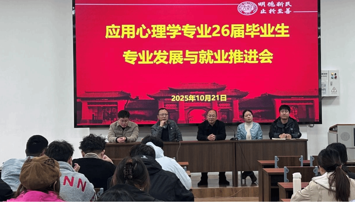 为切实做好应用心理学专业2026届毕业生的专业发展与就业规划工作,帮助同学们明确毕业季的核心任务与发展方向,10月21日,应用心理学专业2026届毕业生专业发展与就业推进会在教育学部二楼报告厅顺利召开,2026届应用心理学专业全体毕业生参加会议。