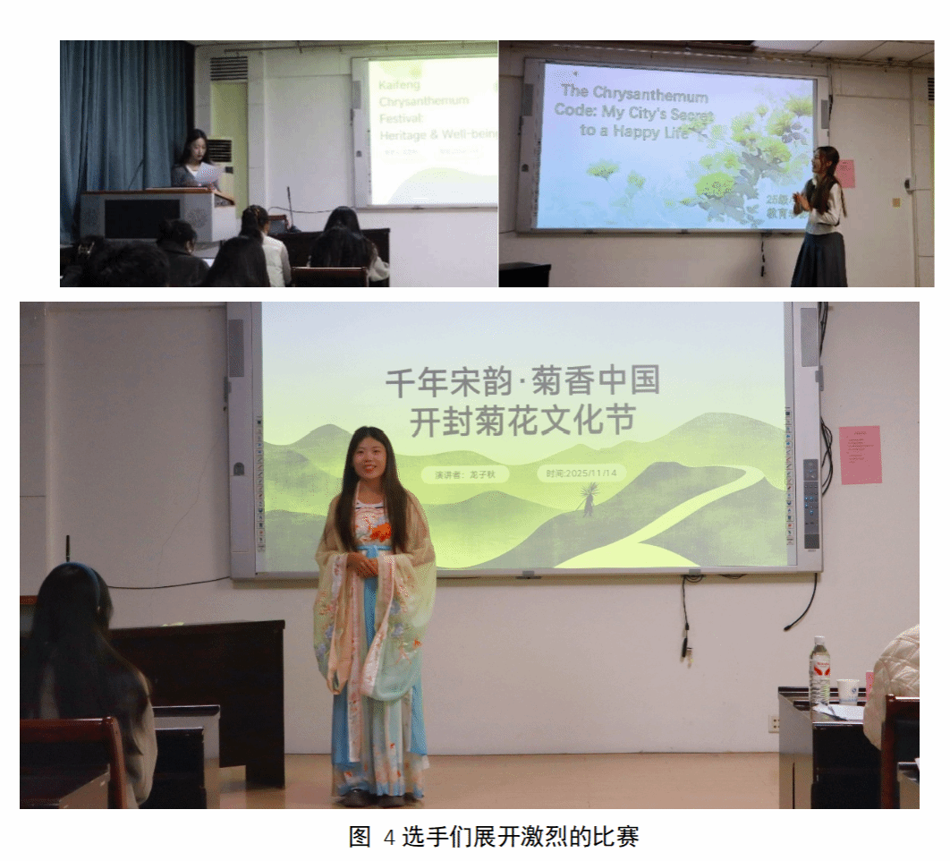 现场气氛热烈,选手们围绕开封菊花文化节的历史底蕴、文化内涵与现代意义展开精彩演讲。他们以流利的英语、独到的见解和饱满的情感,展现了教育学部学子们的风采,也体现了新时代青年对本土文化的深刻理解与自信表达。