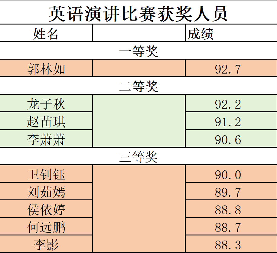 最后经过激烈的角逐,郭林如选手以精彩的演讲表现、标准的发音、流利的口语荣获一等奖,龙子秋、赵苗琪、李萧萧获得二等奖,卫钊钰、刘茹嫣、侯依婷、何远鹏、李影等人获得三等奖。