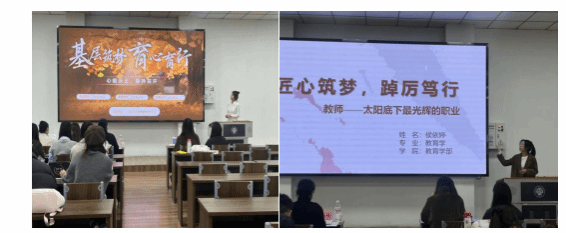 比赛分为“主题陈述”与“综合点评”两个环节。在主题陈述中,选手们围绕个人职业目标、能力储备与实践经历进行了系统阐述,展现出清晰的职业发展路径和扎实的专业素养。其中,刘露洁同学以“基层筑梦,育心育行”为主题,阐述了成为一名基层心理健康教育教师的职业理想。她分享了“心植沃土,静待花开”的教育理念,并通过乡村公益夏令营等实践经历,展现了投身基层教育的坚定信念。在综合点评环节,评委老师围绕实际工作场景提出问题,选手们沉着应答,逻辑清晰,充分体现了教育学部学子的综合素质与应变能力。