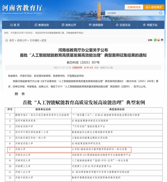近日,河南省教育厅公布了首批共23个“人工智能赋能教育高质量发展高效能治理”典型案例,学部王萍教授牵头申报的“云书院+智能体助力教师教育职前职后一体化发展”案例成功入选,成为河南大学唯一入选的案例。
