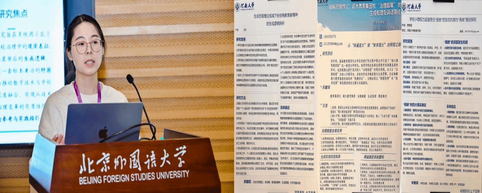 11月29日下午,代梦茹在“九零后教育学人”研究生学术论坛上作了题为《学校治理中的“数字悬浮”:现实表征、内在机理及应对策略》的学术报告。曹舰文、贾慧莹、邱新三位同学则通过海报形式展示了各自的论文成果。经论坛评审,代梦茹的论文荣获2025“九零后教育学人”研究生学术论坛三等奖,曹舰文、贾慧莹、邱新的论文作品均获评优秀作品奖。