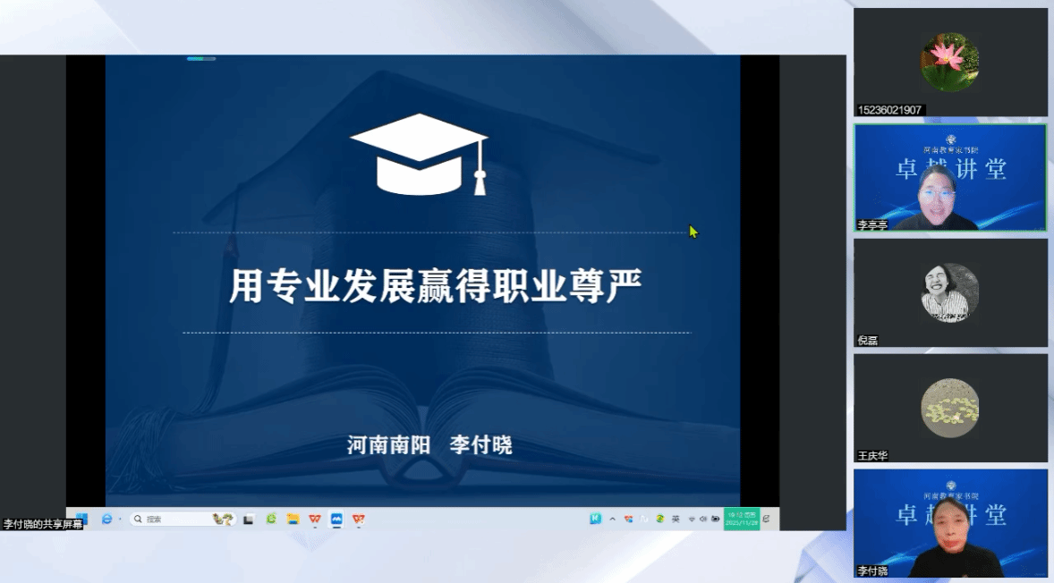 在“何为教师职业尊严”这一部分,李付晓老师先介绍了教师职业尊严的内涵,即教师在教学活动中,因自身的价值、教育教学能力得到社会的认可和尊重,从而产生的自我价值感和自豪感,接着李付晓老师分享了她对职业尊严的思考:尊严来自能力,能力是干出来的。当我们专业发展了,我们就会享受职业的尊严,从而提升人生的幸福。