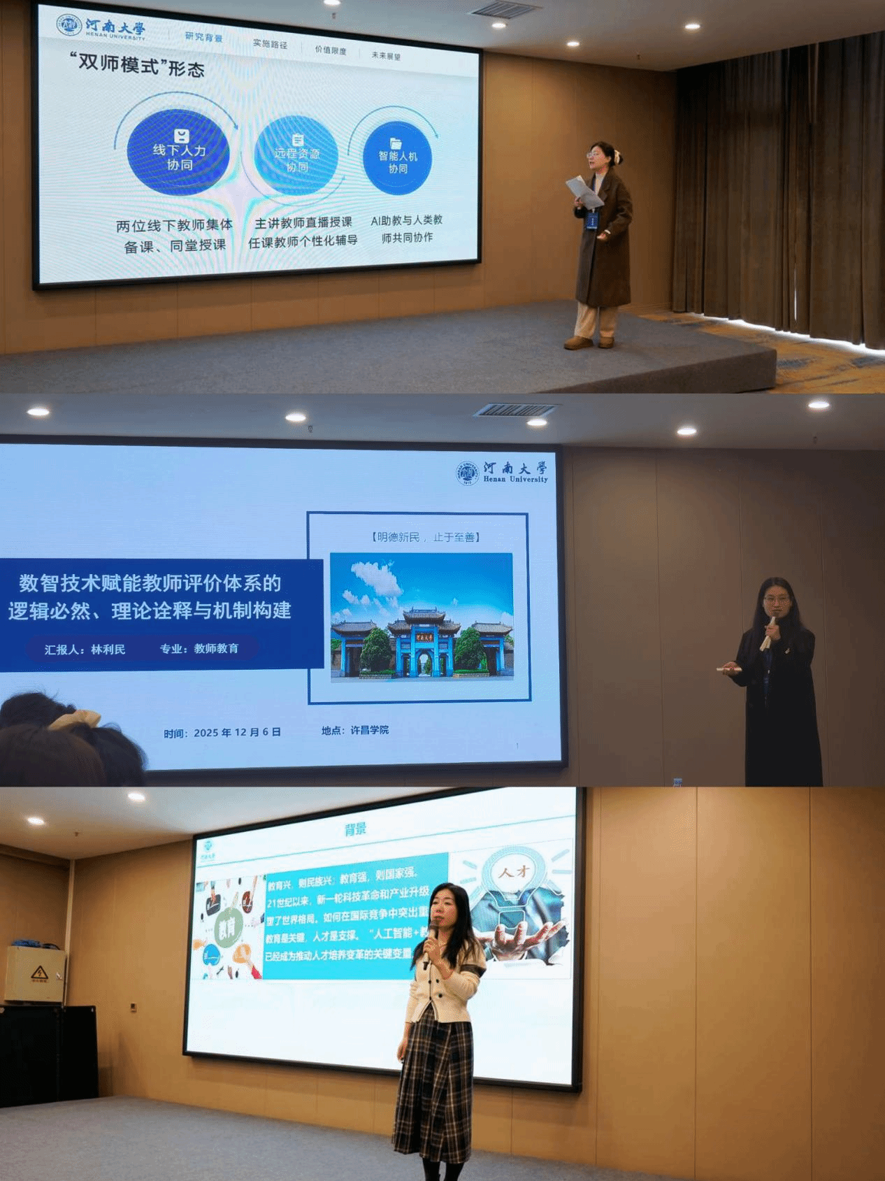 在分论坛二“数智时代的教育变革探索”中,曾琪琪、林利民、刘丽强依次作了题为《智能协同重塑课堂:AI 赋能下双师课堂的实施路径与价值限度》《数智技术赋能教师评价体系的逻辑必然、理论诠释与构建机制》《建构、解构与重构:数智化时代教师专业发展的变革、挑战及应对》的汇报。