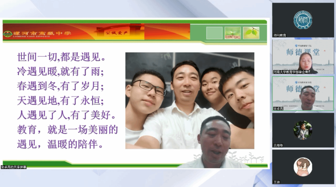 12月4日下午15:00,河南教育家书院师德课堂第十季第五讲顺利开讲。中小学副高级教师,漯河市高级中学生物教师,市优秀教师、市优秀班主任以及市级教育教学标兵、市骨干教师、市教育系统学雷锋活动先进个人孙占峰受邀作题为《教育—美丽的遇见,温暖的陪伴》的讲座。本次讲座由河南大学教育学部教师梁会青主持。