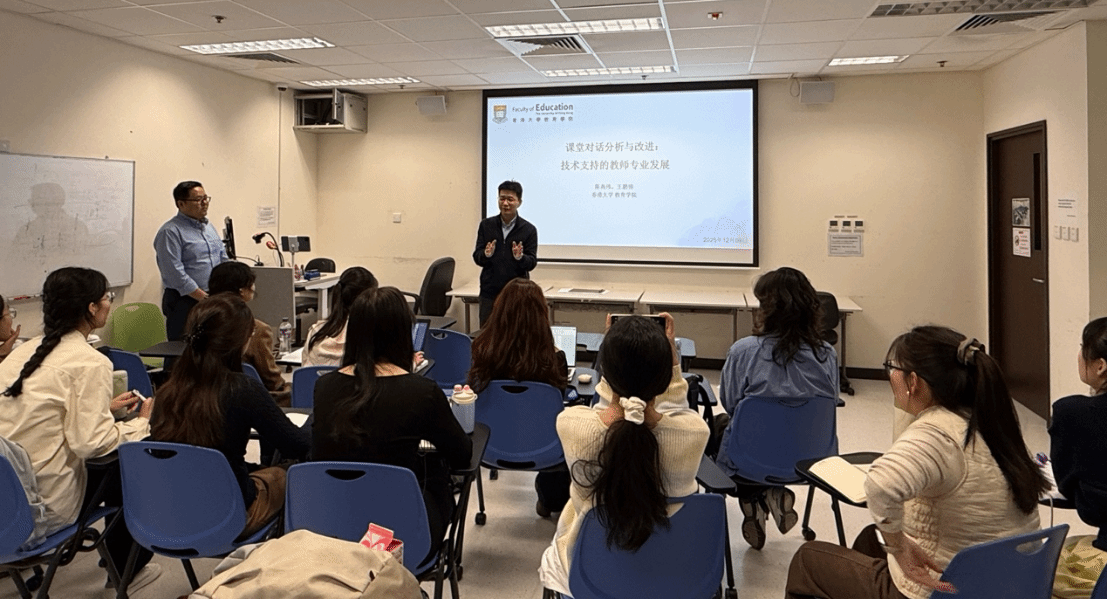 在《课堂对话分析与改进:技术支持的教师专业发展》讲座中,陈高伟教授围绕“何为有效课堂对话”,系统介绍了其团队研发的课堂对话可视化分析平台,并现场演示了该平台在教师专业发展中的应用路径。陈高伟教授与研究助理王鹏锦共同引导同学学习“学术性对话策略(APT moves)”中的八项教师提问技巧,并组织对真实课堂片段进行对话编码实践,生动展现了技术赋能教学反思的实践价值。