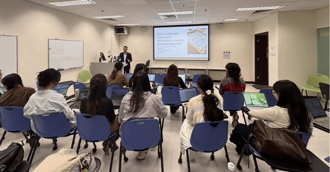 在《AI for multimodal assessment innovations in language education》讲座中,蒋联江教授从当前教育面临的“评估危机”出发,引导同学重新思考“何为值得评测的能力”,系统阐释了语言教育中多模态评估的理论框架与实践路径。他强调,多模态素养的核心在于意义的主动建构,多模态评估在促进学生综合语言能力与认知发展方面具有重要价值。