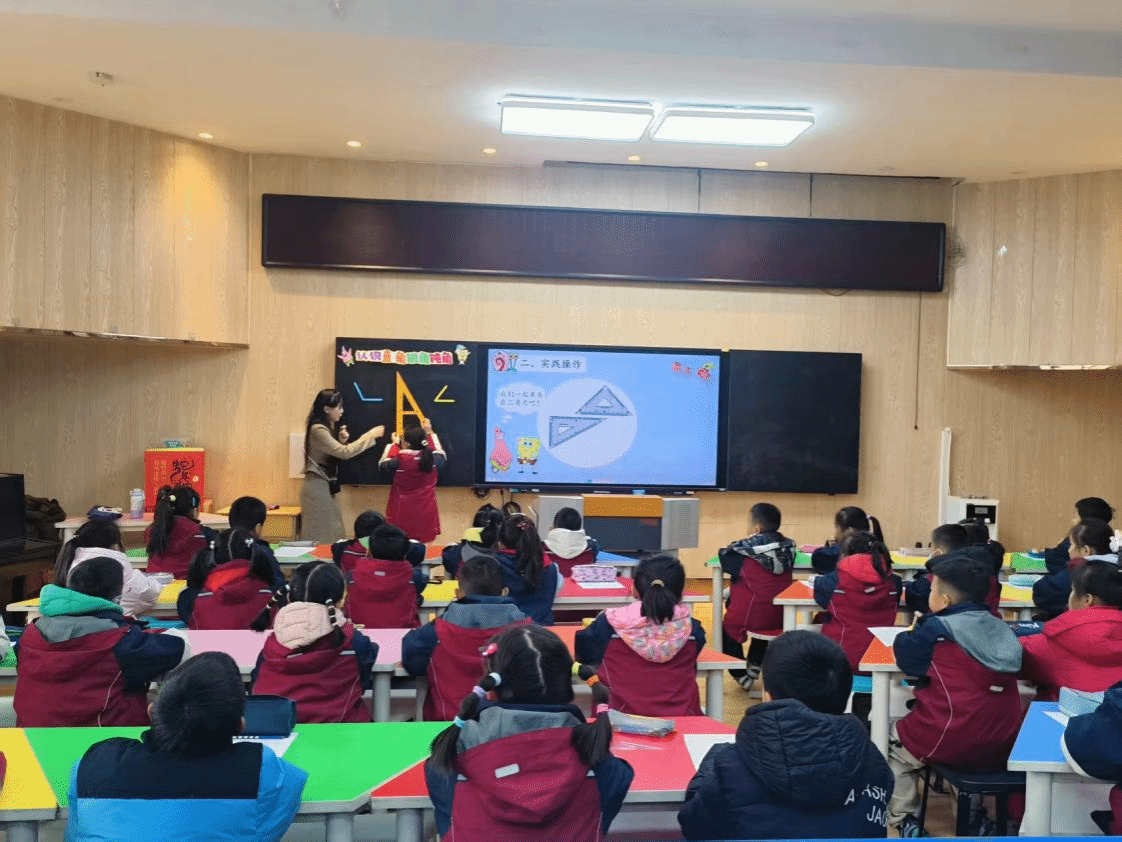 授课过程中,冯旭根据二年级学生的认知特点,以“海绵宝宝”情境贯穿课堂,通过图片识角、生活寻角、“手指角”游戏和三角板测量等环节,引导学生观察和区分三类角的不同特征。课堂氛围活跃,学生参与度较高。