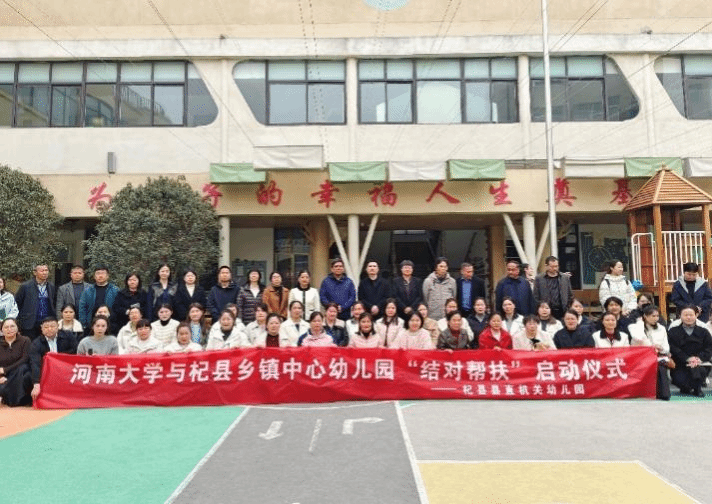 2026 年 3 月 23 日上午,河南大学与杞县乡镇中心幼儿园“结对帮扶”省级项目启动仪式在杞县县直机关幼儿园成功举办。河南大学教育学部党委副书记王刚、学前教育学系岳亚平、张亚杰、李晓敏、王峥、王宇锋、陈乐乐等老师共同参与,开封市教体局、教科院、杞县教体局、杞县乡镇中心幼儿园主要负责人及骨干教师等出席本次活动。启动仪式上,开封市教体局、杞县教体局相关领导、教育学部党委副书记王刚、岳亚平教授等先后致辞发言,共同开启河南大学与杞县乡镇中心幼儿园三年“结对帮扶”活动。