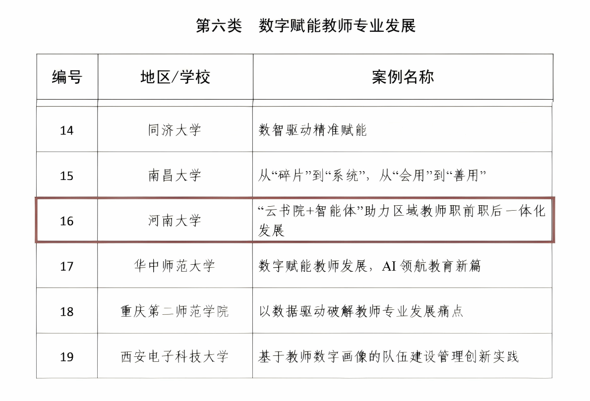 3月24日,“新时代高水平教师队伍建设创新案例(2025)”正式发布。河南大学提交的《“云书院+智能体”助力区域教师职前职后一体化发展》成功入选2025年新时代高水平教师队伍建设“数字赋能教师专业发展”领域创新案例,该类别全国共19个。