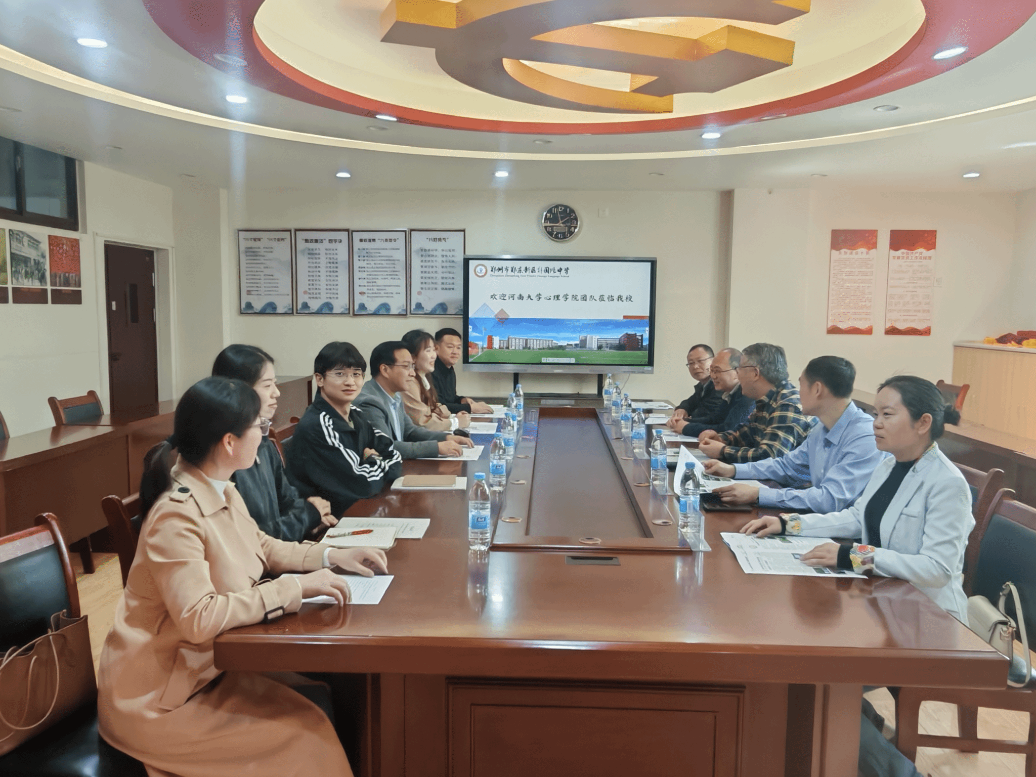 随后,教师团队与各实习学校的领导、教师代表开展了深入的交流座谈。座谈会上,双方围绕心理学专业人才培养、中学心理健康教育体系建设、实习基地深化合作等议题展开充分研讨。李部长代表河南大学教育学部,对各实习学校长期以来给予河大学子的培养与支持表示感谢,介绍了心理学专业的学科建设、人才培养特色与发展规划,希望以实习合作为纽带,搭建高校与中学协同育人的长效平台,共同探索心理健康教育的实践路径,助力青少年心理健康成长。各实习学校负责人对河大实习生的工作表现给予高度评价,分享了中学心理健康教育的实践经验与需求,双方就后续深化合作、共建实习实践基地、开展联合教研等达成了共识。