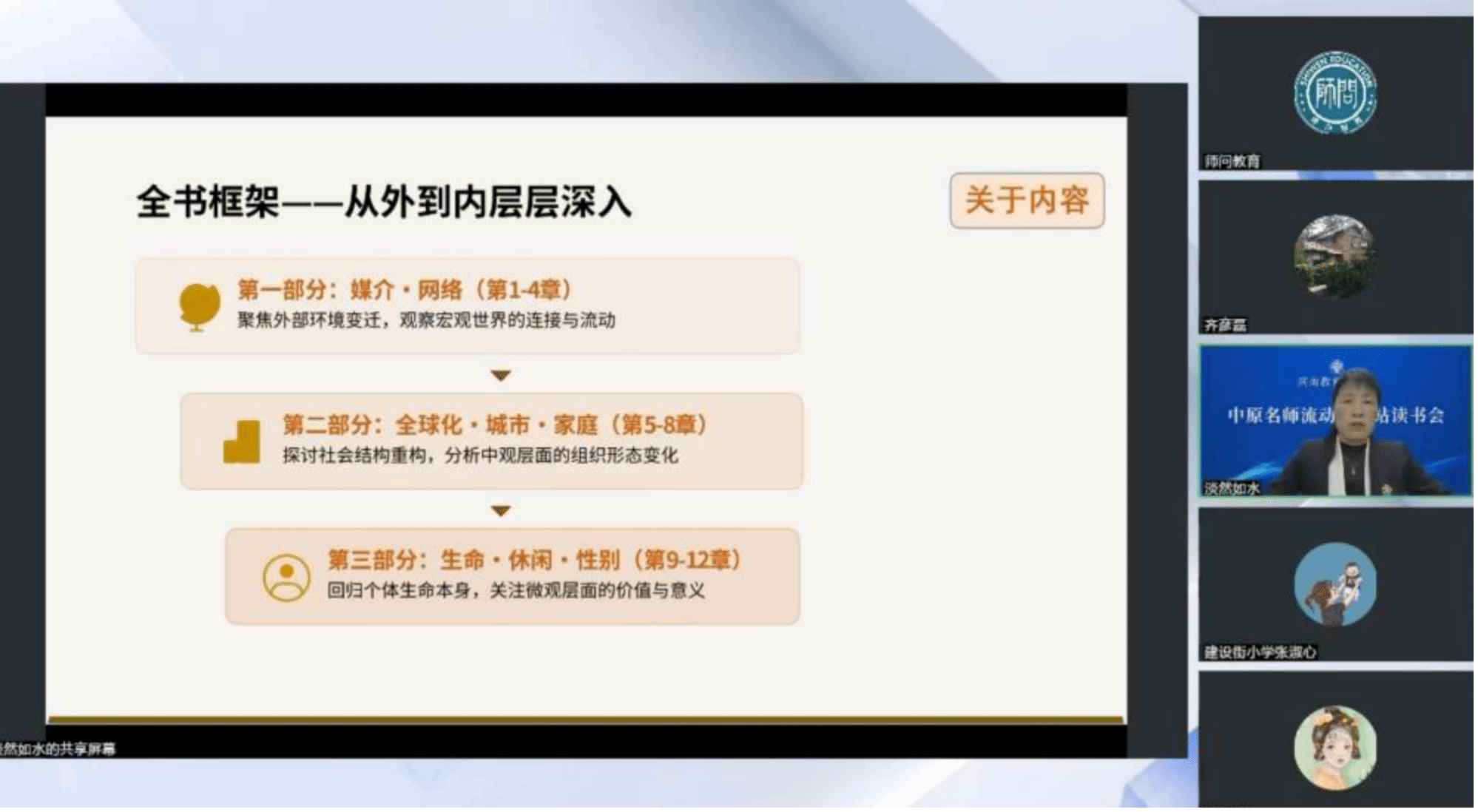 本次读书会围绕引读、呼应、点评、互动四个环节展开。活动伊始,中原名师、平顶山市新华区建设街小学党支部书记、校长苏豪珍围绕书籍核心内容,剖析时代德育困境,明晰人工智能时代育人方向与实践路径,为小学德育工作提供指引。