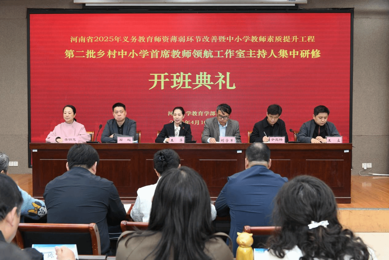 2026年4月10日,第二批乡村中小学首席教师领航工作室主持人集中研修开班典礼在河南大学教育学部一楼报告厅举行。河南大学教育学部副部长、教育学院院长王萍,开封市教育局科长石超,濮阳市教育局科长于党伟,商丘市教育体育局科长李明慧,基础教育研究院副院长刘学军,乡村首席教师培训班主任王立,以及来自开封、濮阳、商丘、周口四市的教育部门相关负责人和全体参训学员参加了典礼。